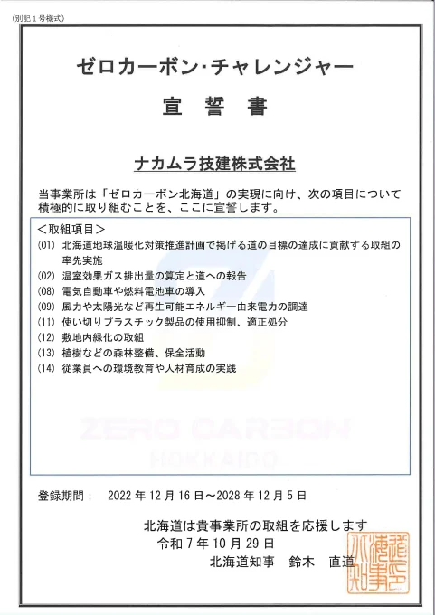 この度、当社は北海道が推進する「ゼロカーボンチャレンジャー」に宣誓いたしました。